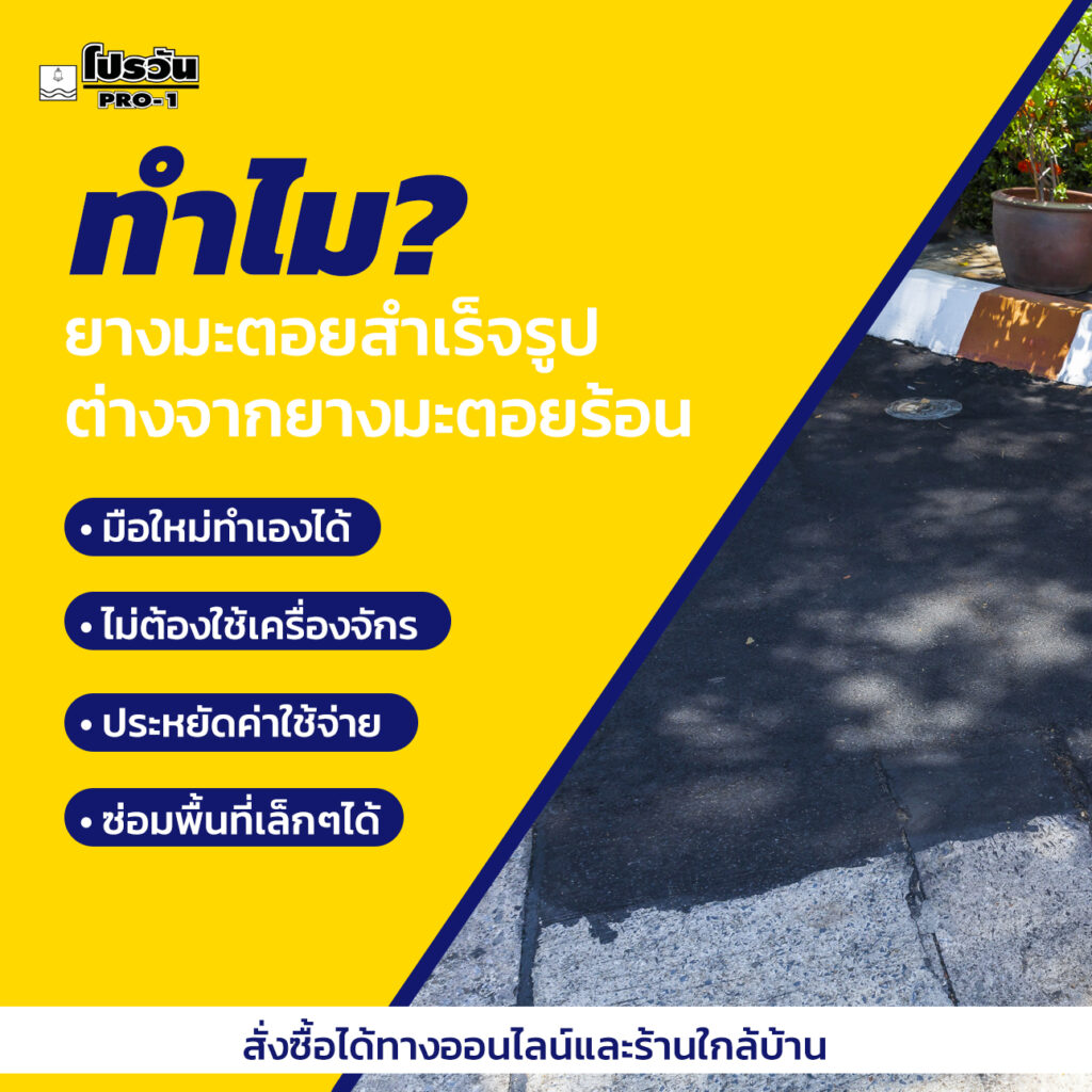- ซ่อมพื้นที่เล็กๆ ได้ทันที: ไม่ต้องรอสั่งซื้อปริมาณมากเหมือนยางมะตอยร้อน ไม่ว่าจะเป็นหลุมเล็กหน้าบ้าน หรือรอยร้าวบนทางเดิน ก็จัดการได้ทันที