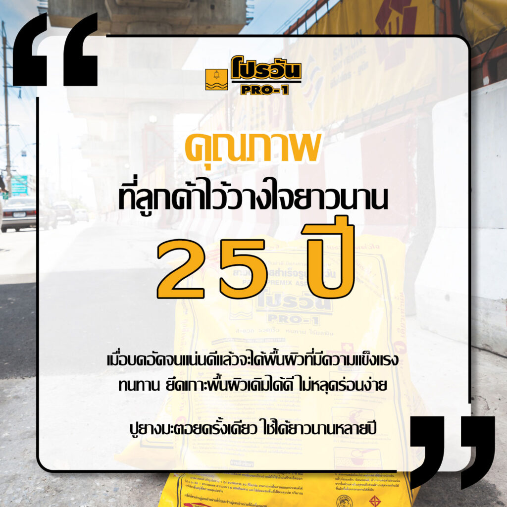 แบรนด์ยางมะตอยที่น่าเชื่อถือ ใส่ใจลูกค้าและสินค้า ครองใจลูกค้ามานาน25ปี และมีพาร์ทเนอร์ที่เชื่อใจได้ นึกถึงยางมะตอย นึกถึงโปรวัน